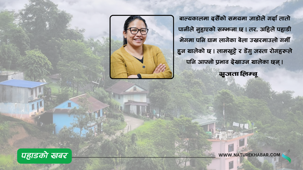 तर, बुवा छोरी गफिँदै गर्दा, बुवाले भन्नु भयो,’मौसम पहिलेको जस्तो छैन । ’बुवाले भने झैँ महसुस गर्दा बाल्यकालमा दसैँको समयमा जाडोले गर्दा तातो पानीले नुहाएको सम्झना छ, तर अहिले पहाडी भेगमा पनि घाम लागेका बेला उखरमाउलो गर्मी हुन थालेको छ।